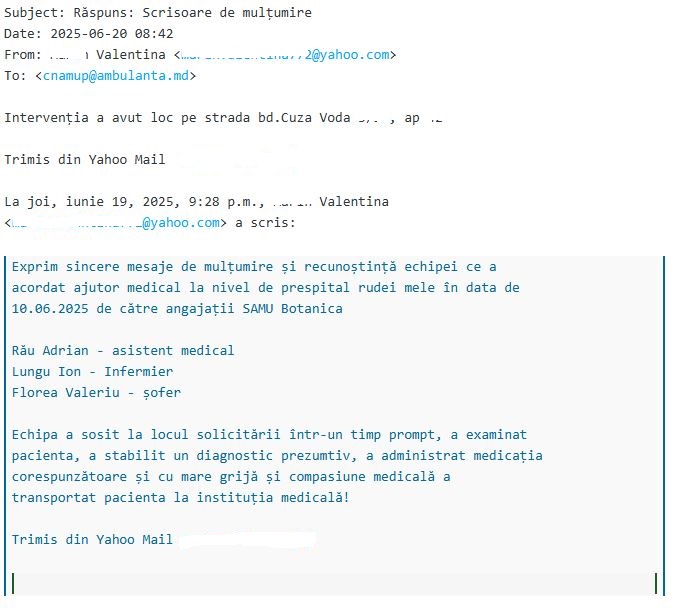 În adresa IMSP CNAMUP au parvenit 2 scrisori de mulțumire adresate echipelor SAMU Botanica, care au intervenit prompt la solicitări, acordând asistență medicală urgentă la etapa de prespital.