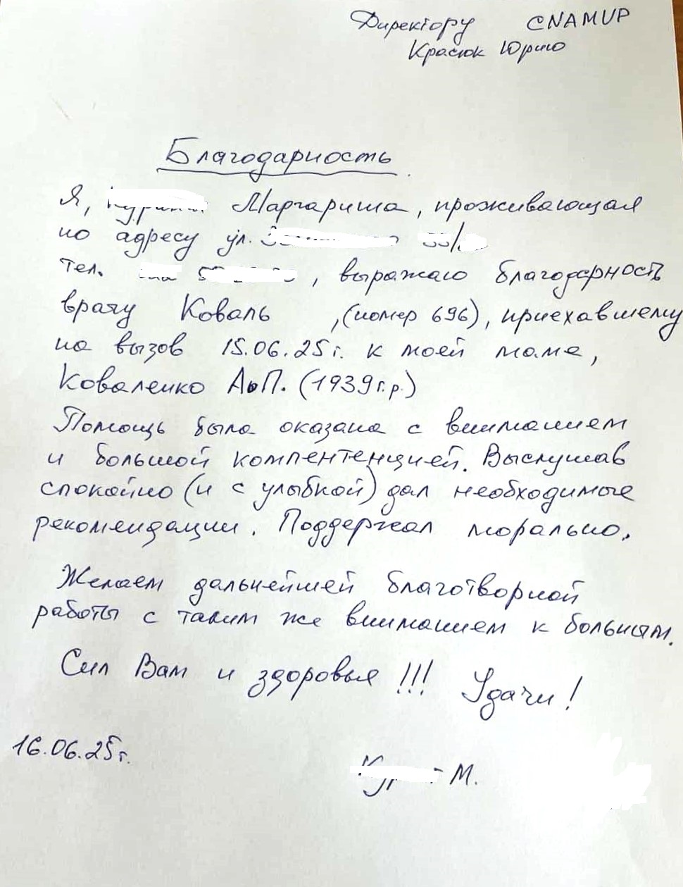 Echipa SAMU Ciocana apreciată printr-un mesaj de mulțumire