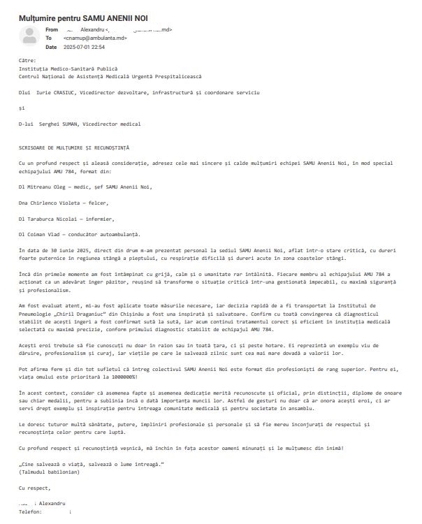 Cu deosebită bucurie, Vă prezentăm o scrisoare de mulțumire parvenită în adresa IMSP CNAMUP din partea unui pacient, care a beneficiat de asistență medicală de urgență la etapa de prespital la data de 30.06.2025.