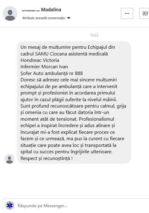 Frumoasele cuvinte sunt adresate echipei de asistență medicală urgentă din cadrul SAMU Ciocana pentru profesionalismul, calmul, grija și empatia manifestate într-un moment critic din viața acestei femei, contribuind decisiv la stabilizarea pacientei și la acordarea primului ajutor într-un timp optim.