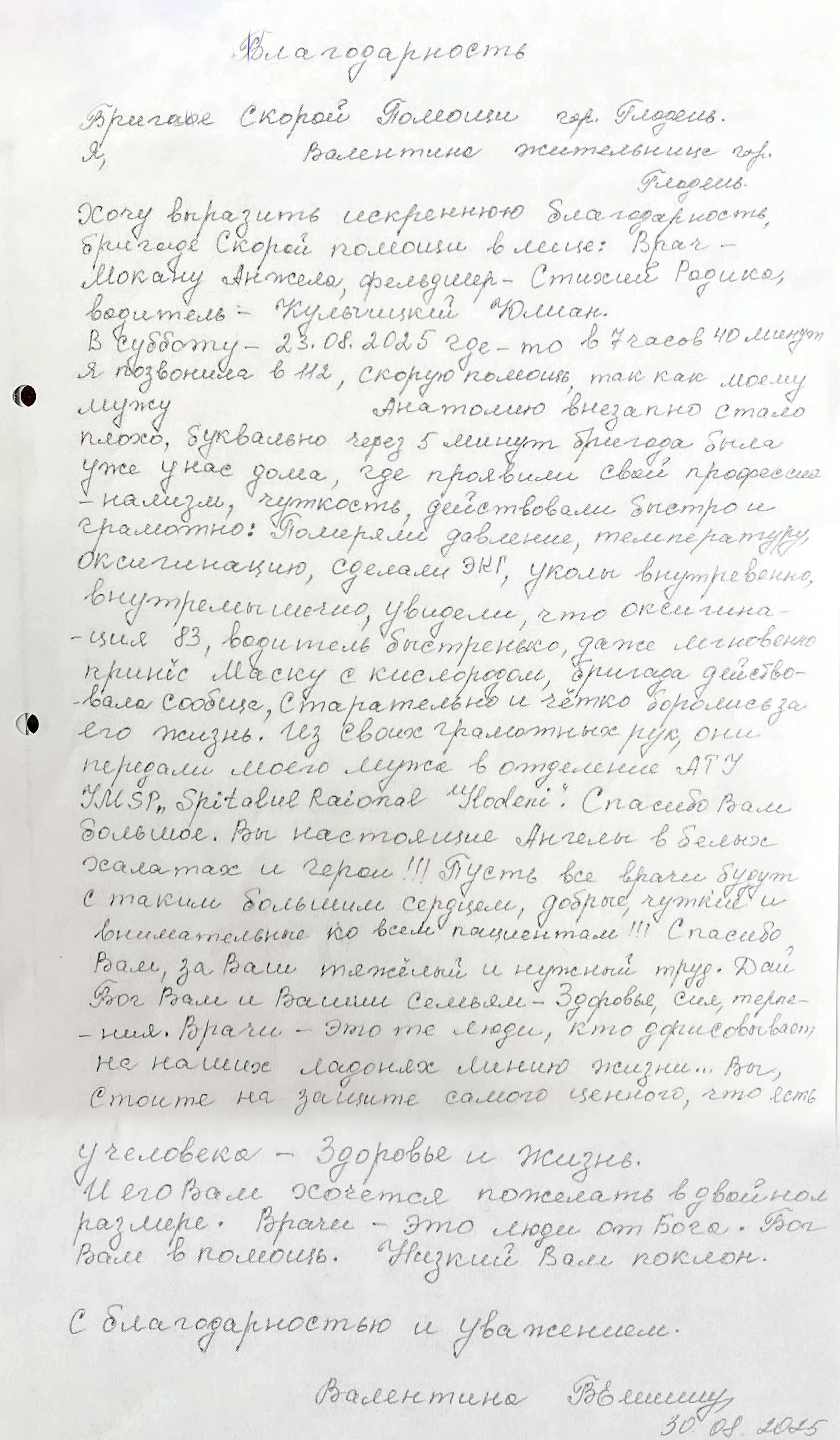 O doamnă a transmis aprecierea sinceră pentru munca depusă de echipa SAMU Glodeni, care a intervenit rapid și eficient la data 23.08.2025, contribuind la stabilizarea și salvarea vieții soțului său.